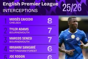 体育资讯9月3日讯 数据机构squakwa统计了新赛季英超球员拦截情况,凯塞多位列榜首。